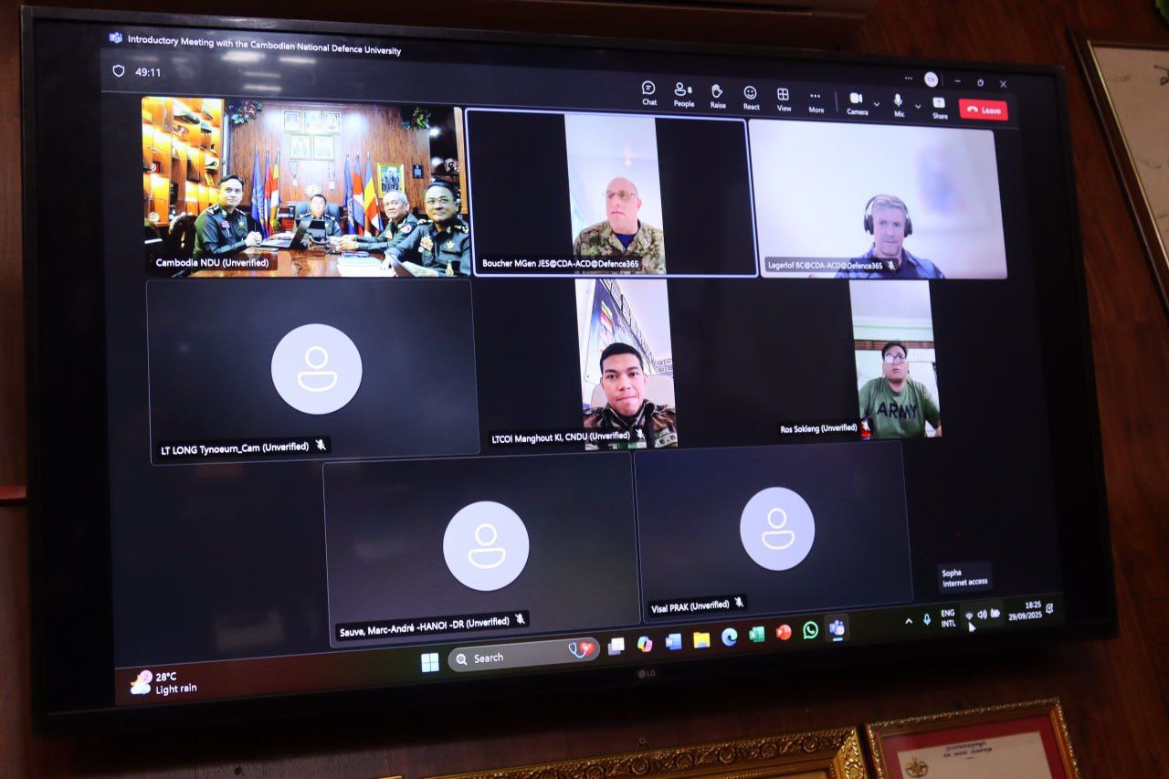 On the evening of Monday, September 29, 2025, His Excellency Lieutenant General Dok Sopha, Rector of the National Defence University, held a virtual bilateral meeting with His Excellency Major General Jeannot Boucher, Commander of the Canadian Defence Academy. The meeting addressed the following matters: - A courtesy call and introductions, noting that His Excellency Major General Jeannot Boucher has recently been appointed as Commander of the Canadian Defence Academy, succeeding His Excellency Major General Denis O'Reilly, who will take up new responsibilities. - Updates on the progress of preparations for the 27th ASEAN Regional Forum Heads of Defence Universities, Colleges, and Institutions Meeting, which Cambodia will host and co-chair with Canada. - Exploration of opportunities for expanding future cooperation, including the possibility of inviting the Commander of the Canadian Defence Academy to deliver a lecture at the National Defence University. It should be noted that from November 18–21, 2025, the National Defence University will host and co-chair with Canada the 27th ASEAN Regional Forum Heads of Defence Universities, Colleges, and Institutions Meeting, with the participation of 27 countries.