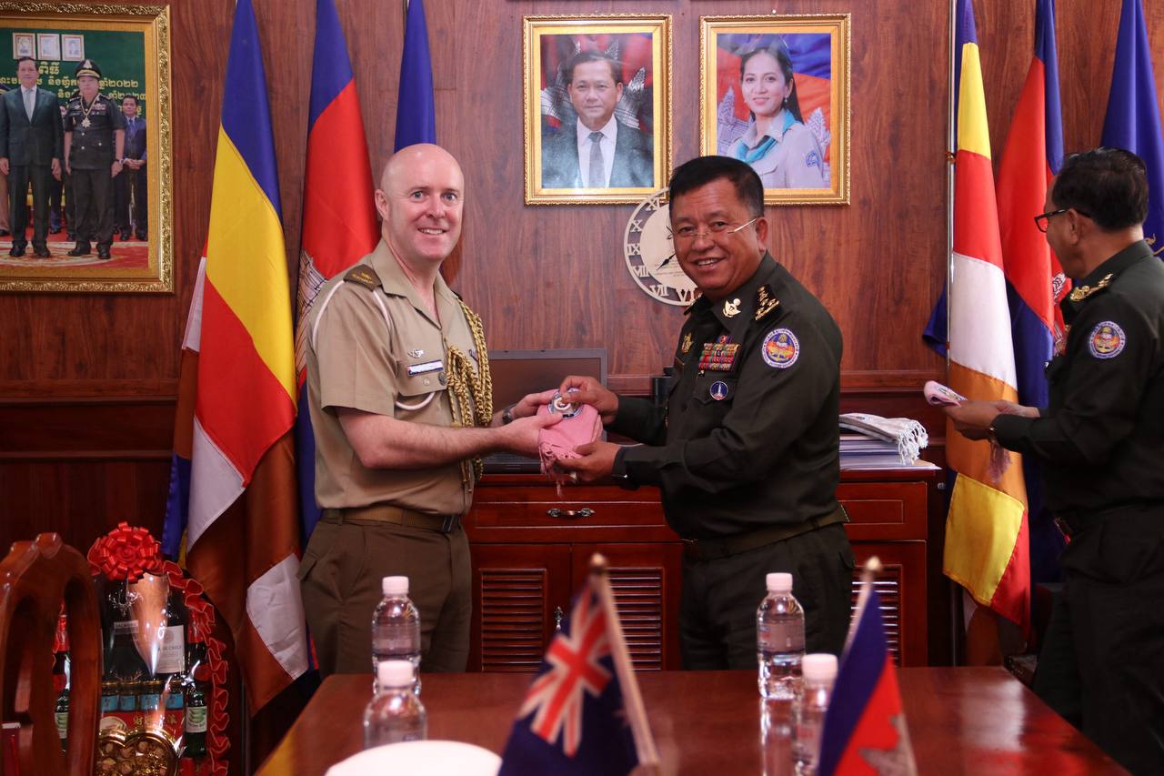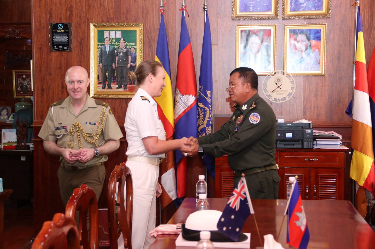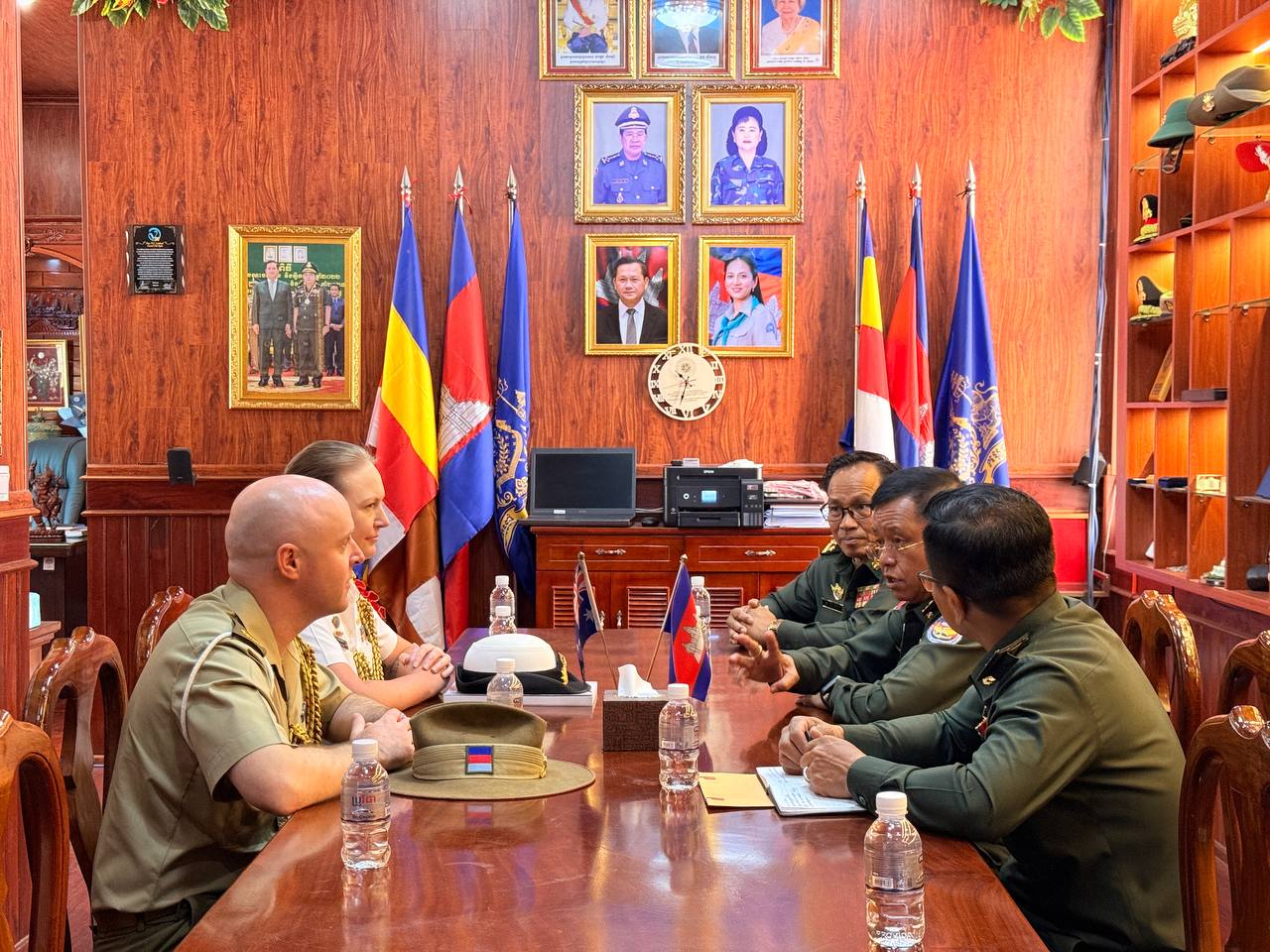 On Thursday morning, January 22, 2026, His Excellency Lieutenant General Dok Sopha, Rector of the National Defence University, received the outgoing and incoming Australian Defence Attachés at his office for a courtesy meeting, introductions, and a farewell. During the meeting, His Excellency the Rector highly appreciated the significant and positive contributions of Lieutenant Commander Karleah Fitzpatrick, the outgoing Australian Defence Attaché, to Cambodia–Australia bilateral military cooperation, particularly in the field of military education. At the same time, His Excellency the Rector extended a warm welcome to Major Henry Dudley-Warde, the newly appointed Australian Defence Attaché, and expressed strong confidence and optimism that bilateral cooperation would continue to expand and deepen during his term of office.